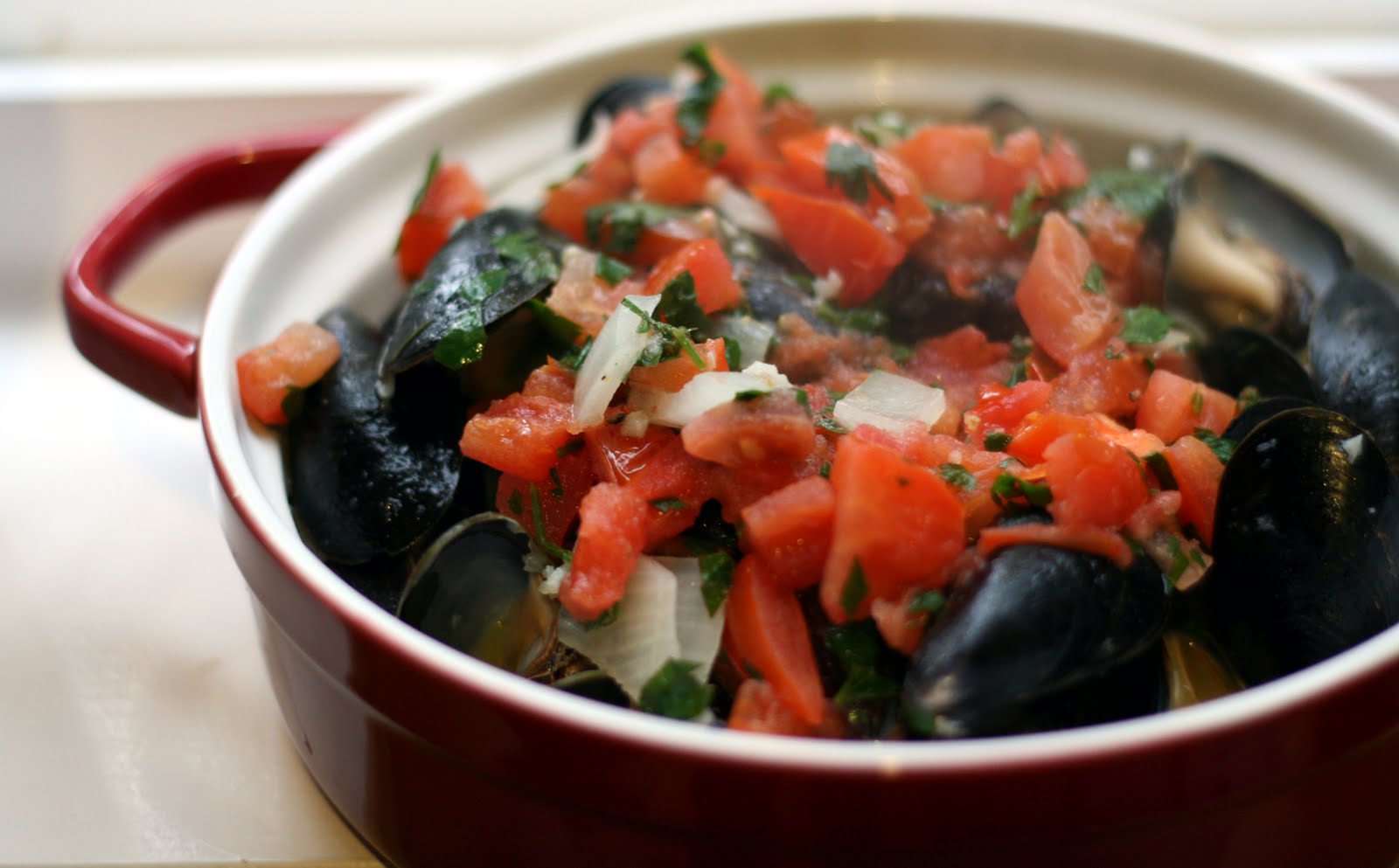 Mussels were on sale at the market today and I have been wanting to try making them at home for a long, long time so I decided to go for it. When I got home I did some extensive 'net research to ensure I prepared the mussels in the healthiest and most sanitary way possible. One of the things I came across was this hilarious YouTube video of a French Chef preparing "Moules Provencales". I based this recipe on his tutorial and it turned out great.