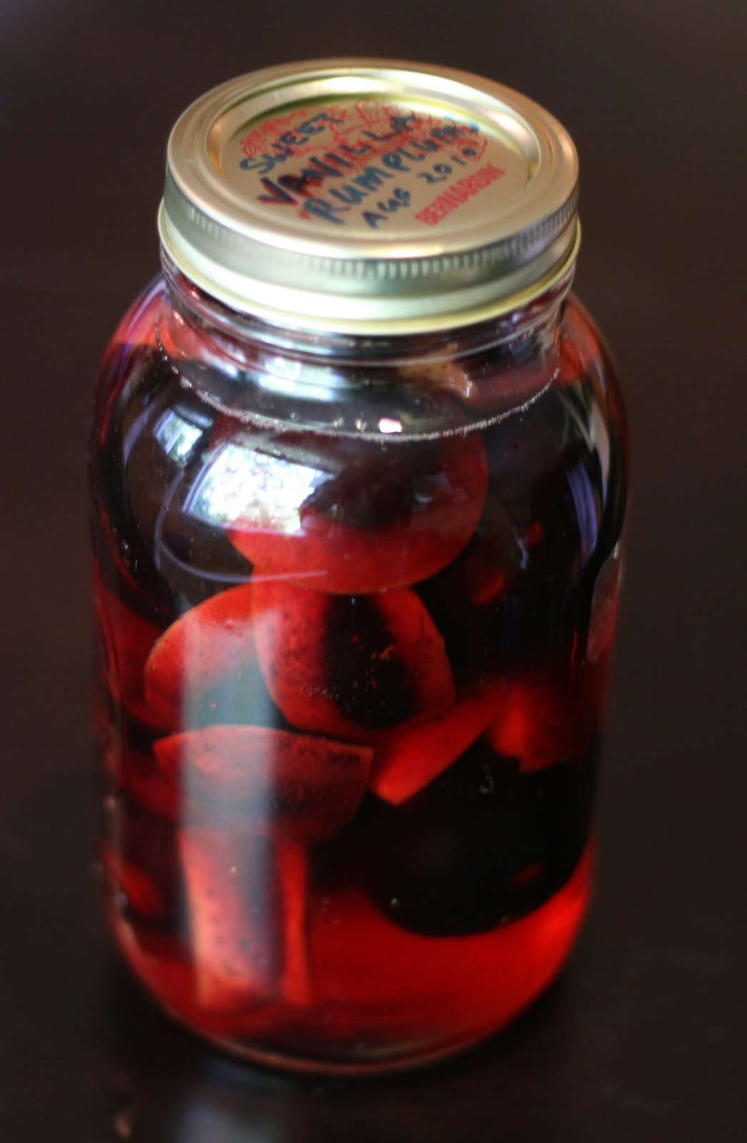 For my first creation, I improvised Jenny's recipe for Vanilla Rum Plums. I used a mix of small local black plums from Osoyoos and larger black plums from California. A bit of a cheat but they were in my fridge for some reason, so I figured I would use them up. I used a 1 litre canning jar. I had to cut the larger Californian plums into quarters (around the pit) to fit into the jar. The local plums I just pricked with a fork and popped them into the jar whole. Then I added 1/2 cup of sugar, 1 teaspoon clear vanilla and enough Vanilla flavoured rum to cover all the fruit and fill the jar. As luck would have it, I had EXACTLY enough rum left in the bottle to fill the jar, right down to the last drop!