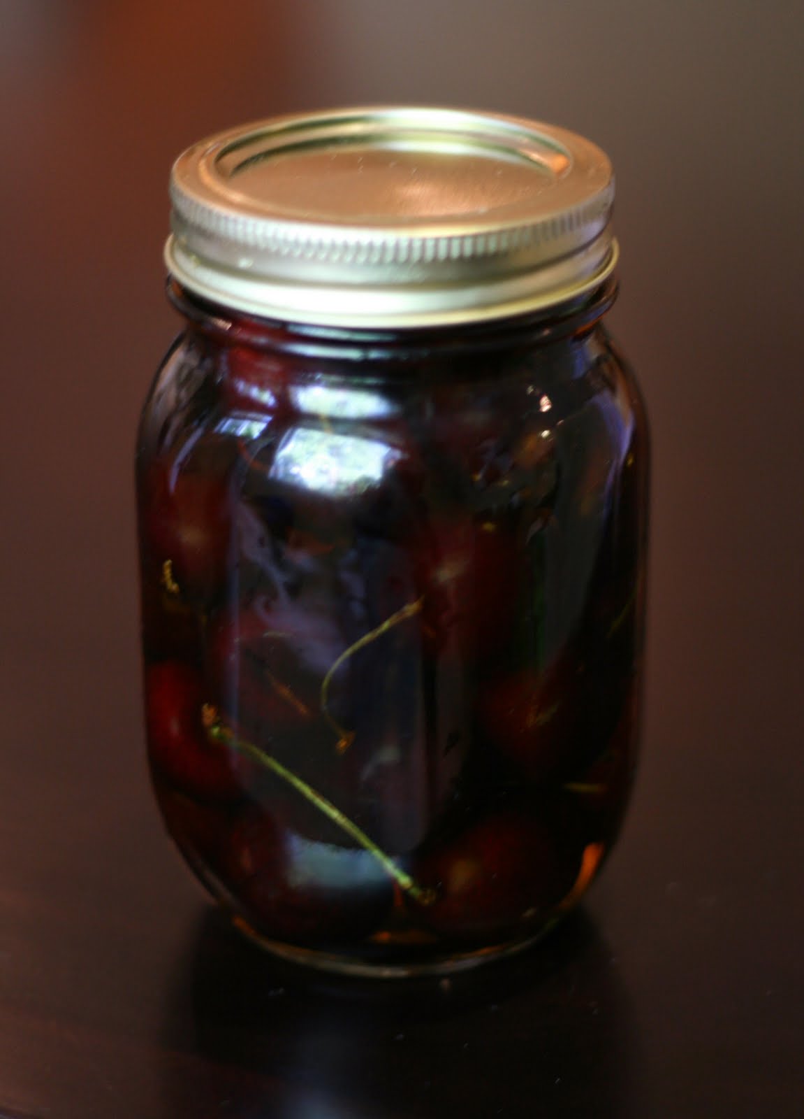 My last creation, as posted the other day, cherries in Brandy! I couldn't decide if I should leave the stems/pitts intact and use the cherries for garnish or pitt and de-stem them for use in desserts and baking. I decided to do both. I made one 500ml jar of de-stemmed and pitted cherries and one 500ml with stems and pitts. The latter will be used in drinks and on top of desserts. The former will be used inside tarts, pies and other baking/cooking applications. I followed the same process as above. Cherries, 1/4 cup sugar per jar, alcohol to fill. For all my creations I chose not to simmer the alcohol with the sugar. I didn't want to jeopardize the alcohol content by heating it. Instead I used the good old "shake" method - put the fruit, sugar and liquid in a jar, secure tightly and shake your ass off! I continued to shake the jars every couple hours, just to ensure all the sugar was dissolved, then I stored my jars in the bottom of a cupboard. Every couple days I go and shake them up again.