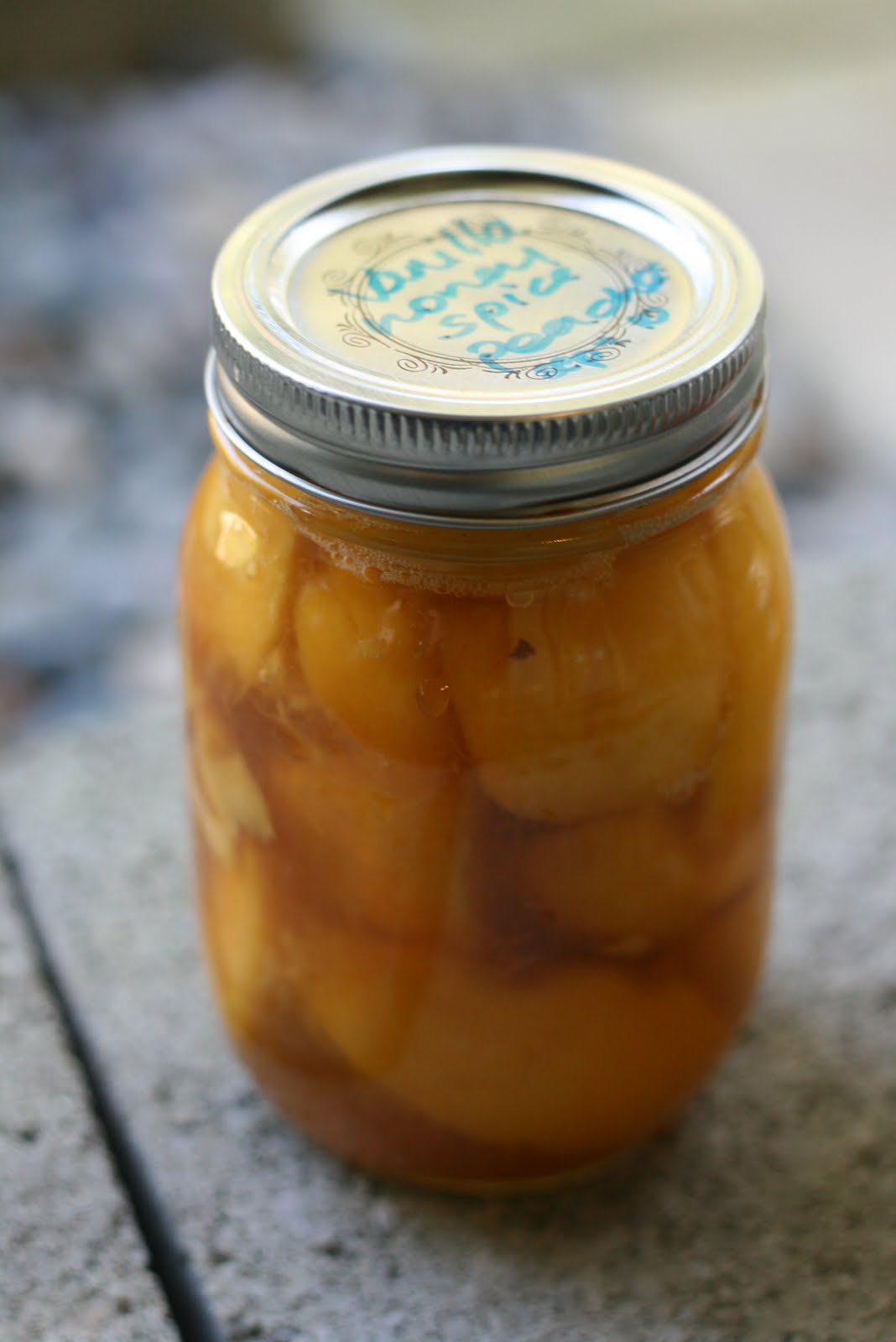 3 pints (500ml jars) Peaches in Honey Syrup, using 5 lbs of Okanagan peaches. (I followed the directions on the Food in Jars website, but instead of 100% sugar, I used 50% honey/50% sugar. One jar also received a piece of Star Anise, a cinnamon stick and a teaspoon of vanilla extract.)