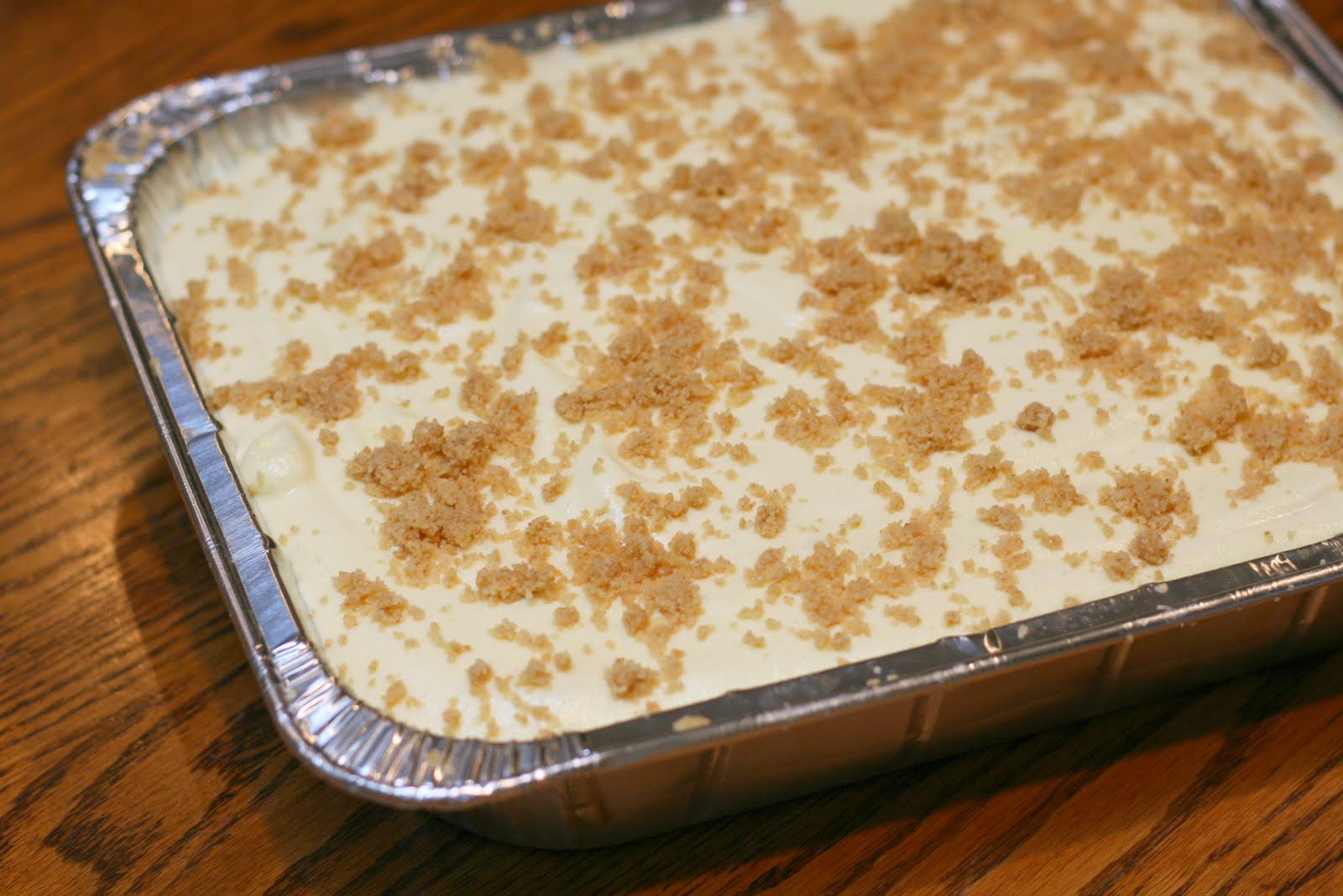 1. Mix 1 1/2 cups graham cracker crumbs and melted butter together in a bowl. Press crumbs into a deep 9x12 inch baking pan, covering the bottom and up the sides about half an inch. Reserve the other 1/2 cup of the crumbs for topping. Refrigerate crust until ready to use.