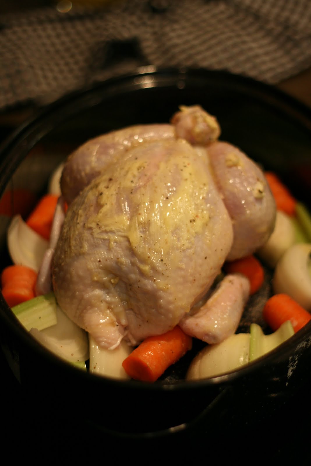 3. Generously salt and pepper the outside of the bird. If you'd like, you can also sprinkle with dried herbs of your choice. Place the chicken, breast side up, on a rack in a roasting pan. Arrange vegetables around the bird in the bottom of the pan. Here's a tip: I don't have a rack for my roasting pan so I propped my bird up ON TOP of the vegetables. As long as the bird doesn't sit on the bottom of the pan, anything goes!