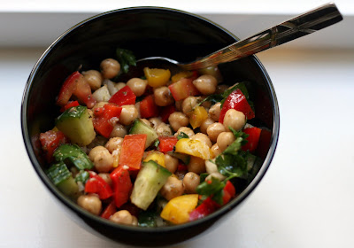 1. Add all the diced veggies & basil to a large serving bowl. Toss well. Add the desired amount of dressing and toss again. Top with Feta and olives.